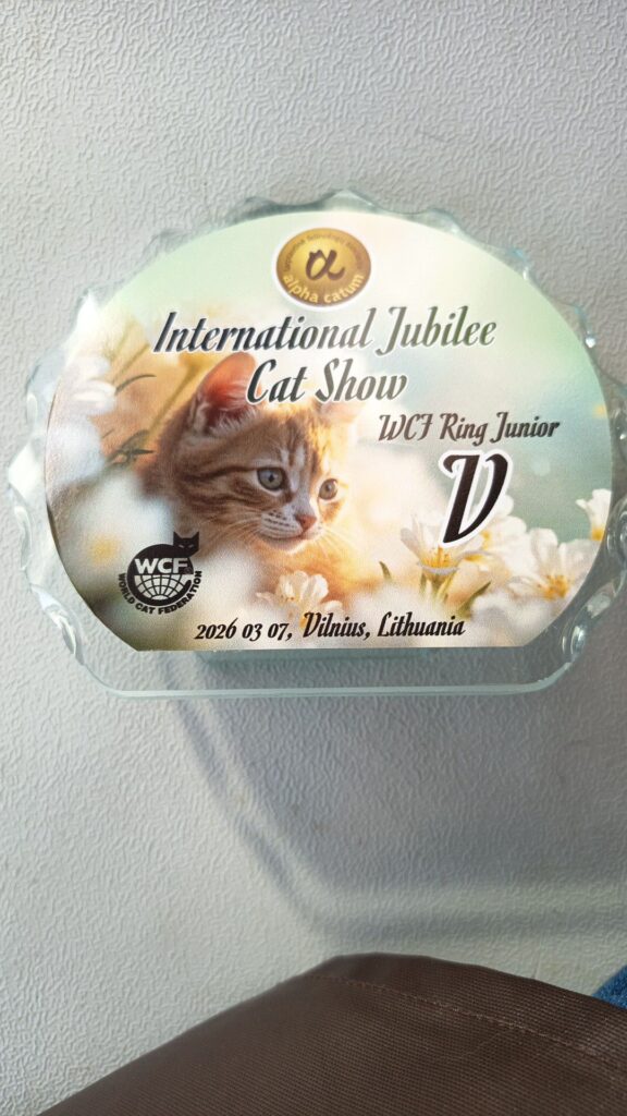 Kocurek otrzymał następujące noty: 3xEX1, 3xCACP, WCF Kitten Ring 14 place, BIS, BOB Kitten IV, uzyskując tym samym tytuł kitten champion